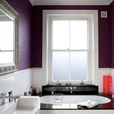 This small bathroom has been brightened up instantly with shimmering metallic wallpaper. This modern bathroom is given a glamorous twist with stunning wallpaper that shimmers in the light. Create a glamorous feature wall with iridescent tiles. Soft grey walls and deep brown floor tiles work well with a contemporary mirror and wall-mounted radiator to create a clean, modern look. A curved shower-bath is a great alternative to a shower enclosure in a small bathroom. Rich purple paintwork teamed with fresh white tiles creates a glamorous feel in this bathroom sanctuary. Create an intimate and glamorous bathroom by combining bold, organic patterned wallpaper with free-standing bathroom furniture.